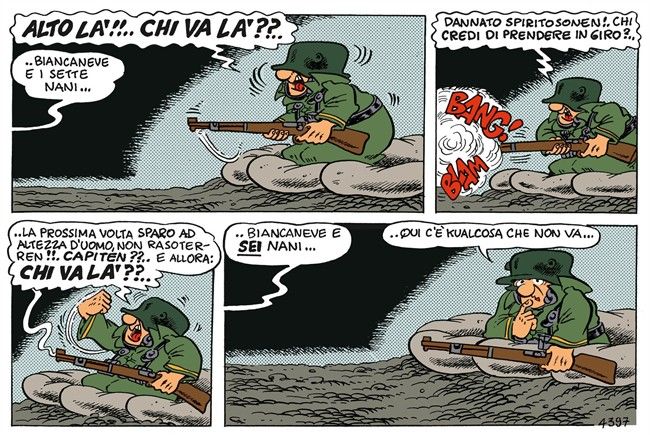 It is a sharp, intelligent, often surreal satire that has won generations of readers. The Sturmtruppen are simple, clumsy, tired soldiers, frequently the victims of senseless orders. They speak in a deliberately distorted language full of ironic Germanisms (kaputt, kameraden, kommandante), which has become a trademark of the series.
